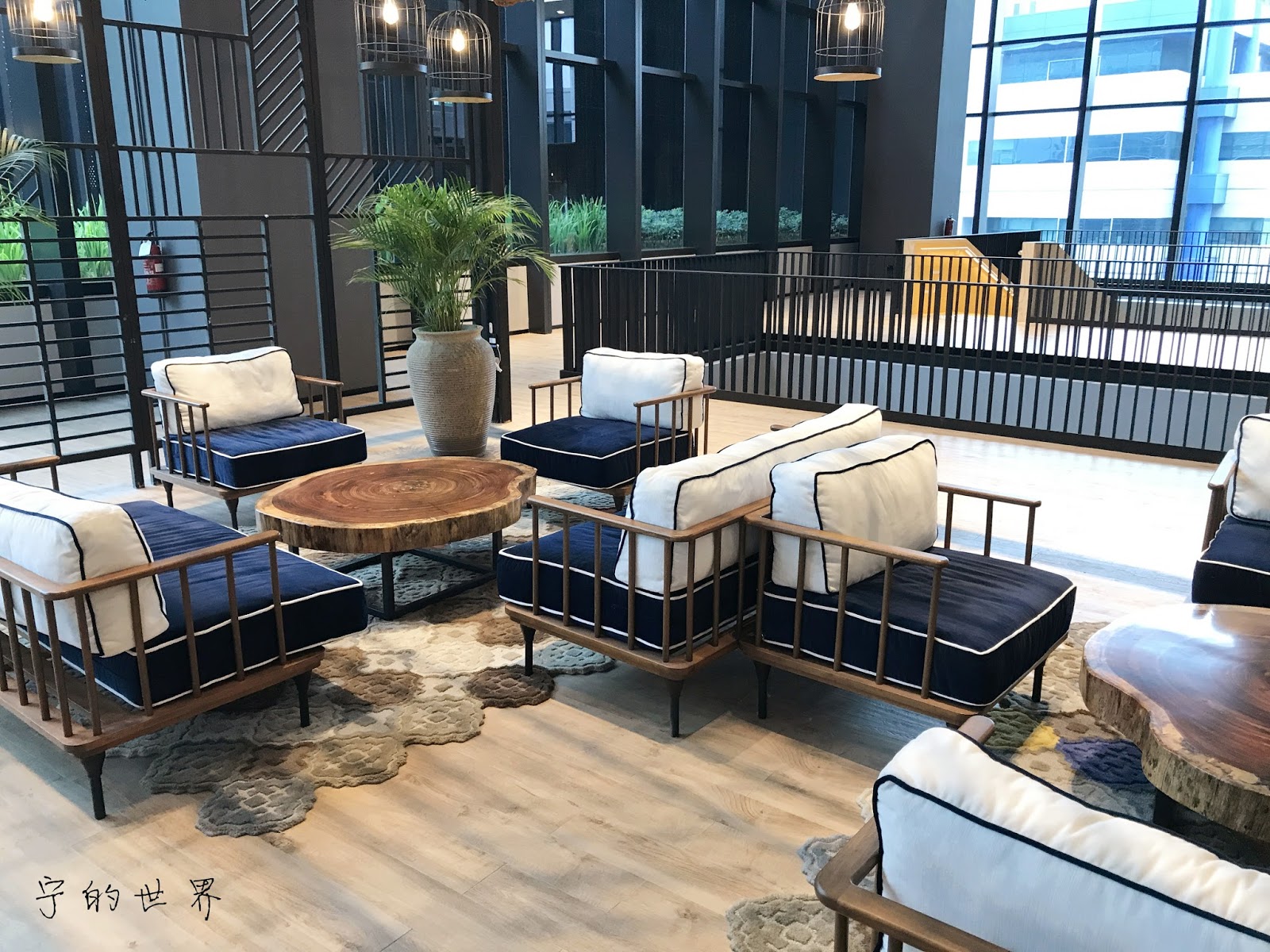 一踏进玻璃门内的角落旁就有一个落地屏幕和一排的沙发